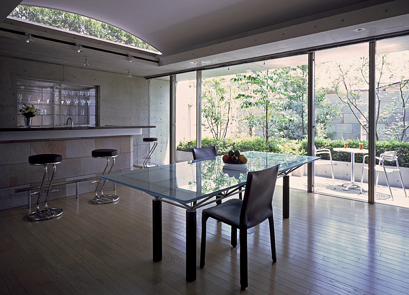 食堂。左手にホームバー、右手外はダイニングテラスのある2階コート。1階コートから延びた植栽ヒメシャラとモミジと1階コートの体となって緑の眺めとなる。これらを囲うように、抗火石の壁が立ち上がり、外界から覗かれない結界を構成する。