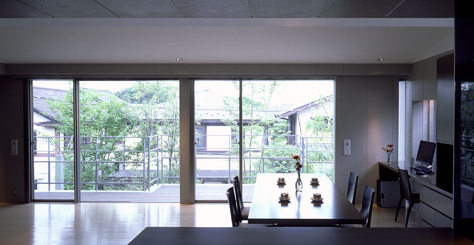 台所より居間、食堂、ベランダを望む。