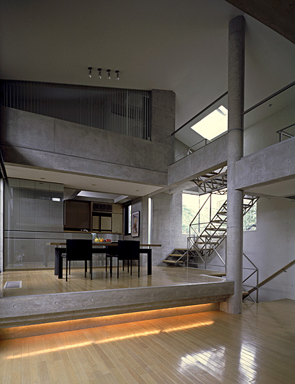 居間より食堂、台所を望む。床の段差には蛍光灯(3A電球色)の間接照明が仕込