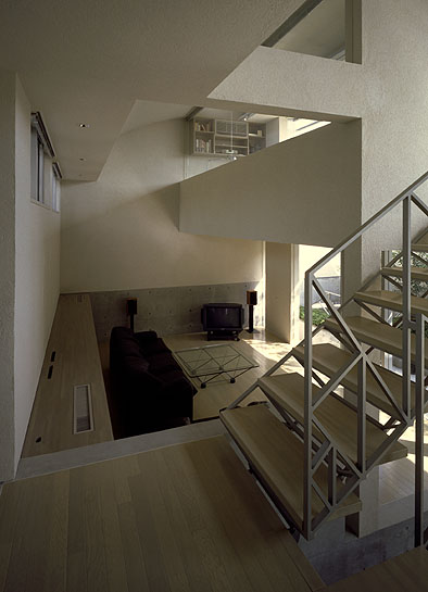 食堂レベルの階段踊り場より、居間を見下ろす。
