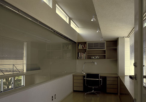 階段を境に左手半階降りて居間、半階上がって書斎。正面にコートを回遊