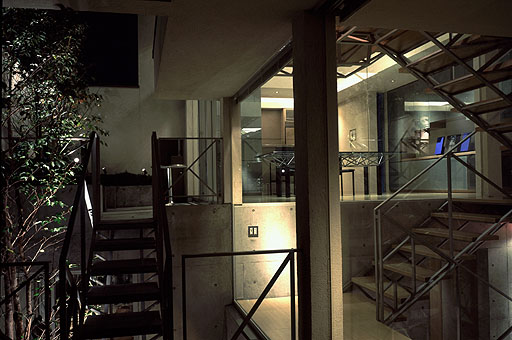 テラスより階段、食堂の夕景を望む。