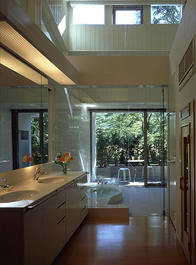 洗面所より、浴室、バスデッキを望む。右手は遠赤外線式サウナ。