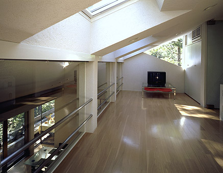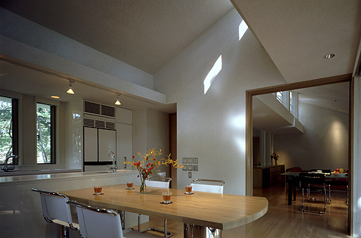 ファミリーダイニングキッチンより、食堂・居間、上部にロフトを望む。