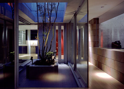 突き当たりのスリットから廊下のアクセントカラー、ディープレッド