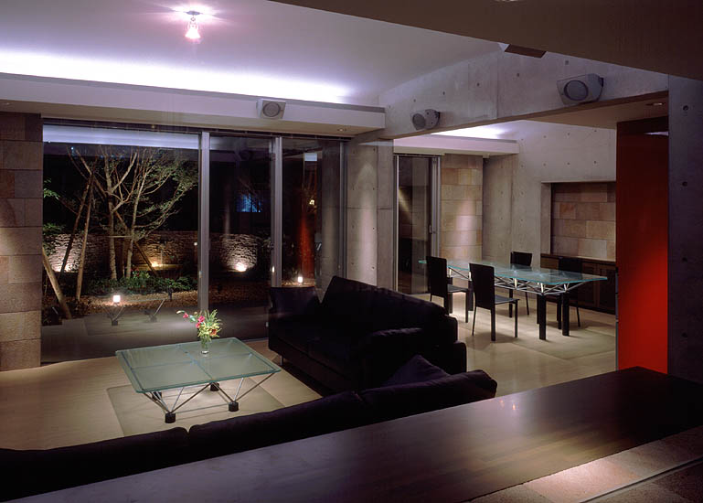 居間、食堂を望む。夜景。