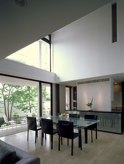 居間より食堂、庭を望む。