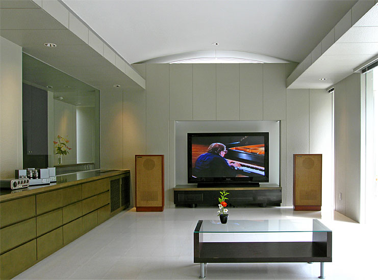 居間のAV装置。 65インチのプラズマテレビの台は AMOオリジナル。 スピーカーは幻の銘機、 グッドマンマンAXIOM80。 エンクロージャーは指定サイズ、 ARU付き。 このエンクロージャー付き AXIOM80はめったに 出ない掘り出しもの。 プリアンプ:QUAD22。 パワーアンプ:QUADII×2。 設計者としては、スピーカーは初 めはTANNOY III LZをお薦め しました。AXIOM80は癖が強 く、その魅力は独特ですが一般的で はありませ ん。しかし依頼主は TANNOYIIIILZ を求めに店に行かれて、たまたま店 にあったAXIOM80を聴いてし まい、その虜になってしまいました。 サウンドボックス扱い。 |