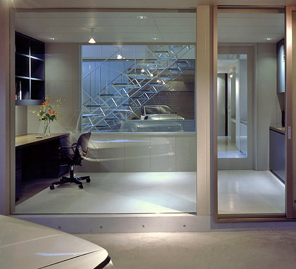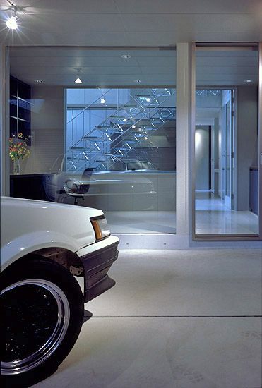 車庫より書斎、エントランス階段を望む。エントランス、書斎よりガレージの車を望む。