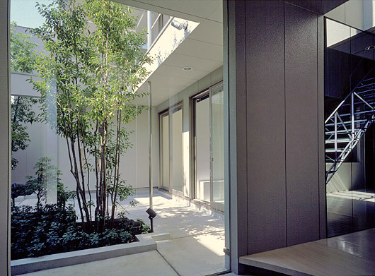 玄関扉を開けるとコートの緑が望まれる。