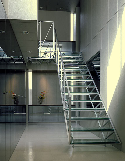 玄関より2階居間・食堂のメインフロアへ上がるトラス・ガラス階段。