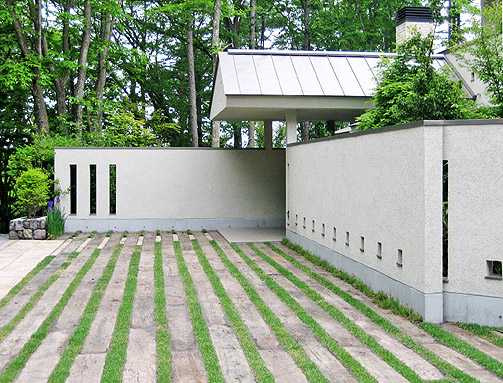 駐車スペースの床は枕木埋め込み、目地に芝生植え込み。