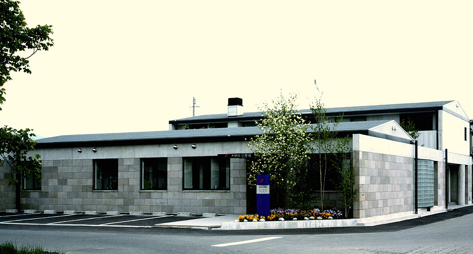 南側外観。手前南側棟はクリニック部分、奥の北側2階建て棟は住宅部分。南側棟と北側棟の間にコート、医局が挟まれて配置だれている。