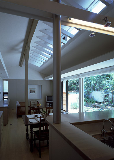 台所より食堂、居間を望む。