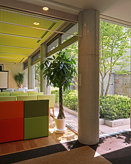 風除室より出てすぐ、待合室とガーデンコートを望む。