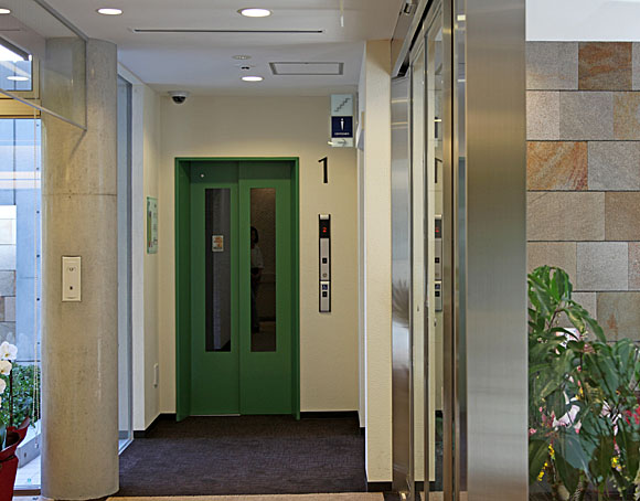 エレベーター扉の色は1階外来フロア庭:ガーデンコートの緑をイメージしてソフトグリーン。