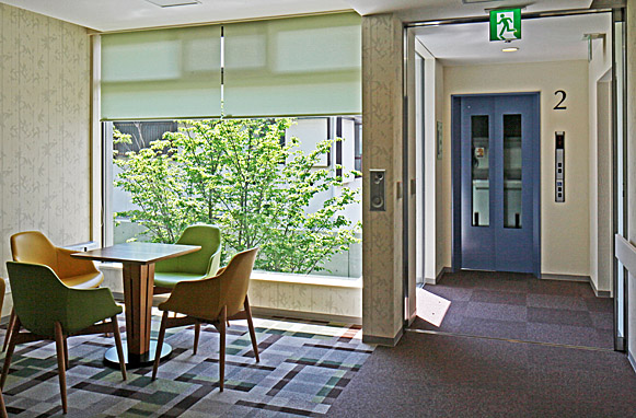 2階待合いサロンよりEVホールを望む。2階は医療度の高いフロアなので、