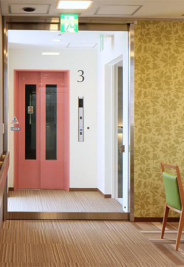 3階は出産前後の入院室フロアで、「祝福」のイメージでEVの扉はソフトピンク。