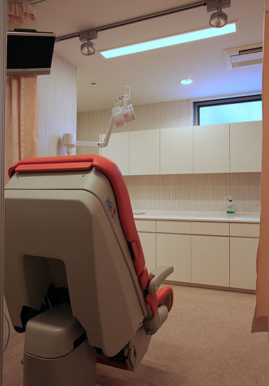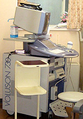 診察室の隣に内診室は(第1)と(第2)の二つある。内診室(第1)。妊婦さんは検診台に乗ったまま自分のお腹の中の胎児の様子を医師の説明を受けながら超音波映像モニターで見ることができる。超音波装置はGE.社製最新鋭機Volson730。