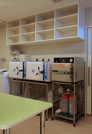 ← 手術室。 手術台上の無影灯は、 従来の天井からぶら下がって くるものではなく、 天井半埋め込みのダウンライト 式、計4基となっている。 このダウンライト式無影灯は、 手元のセンサーの動きを追尾 して、照明角度、照度を手元 の動きに従って追尾、調整で きる。 従来の手術台の上に覆いか ぶさるような無影灯の患者 への威圧感を低減している。 インテリアは家具調にして、 緊張感を与えるステンレス、 等の金属感を排除している。 → 準備室。 手術室全室の準備室には、 ガス滅菌器1基、 高圧蒸気滅菌器2基、 が配備されている。 |