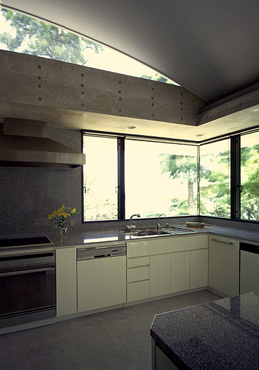 この台所、ファミリーダイニングを一またぎのヴォールト屋根で覆う。