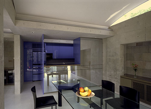 ↑食堂より対面式台所を望む。 の食器棚の扉を半鏡面のカラーガラス貼りにして、食堂から見た台所の生活感 を跳ね返して、セミオープンながらその存在を断ち切る。