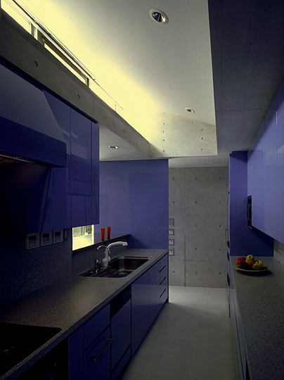 対面式台所。→ 扉面材は鏡面塗装(浜松のグランドピアノ塗装工場で塗装)。甲板はコーリアン。 南面より奥に位置する台所の上部にハイサイド窓を設け、自然光を呼び込む。