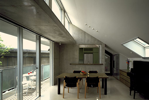 居間より食堂、台所を望む。