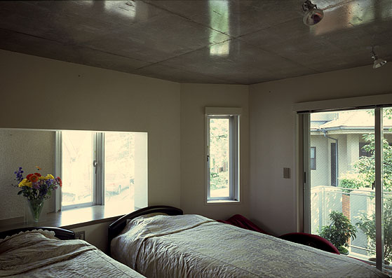 主寝室、天井は階嵩を押さえ天井嵩を確保するため、化粧打ち放し。