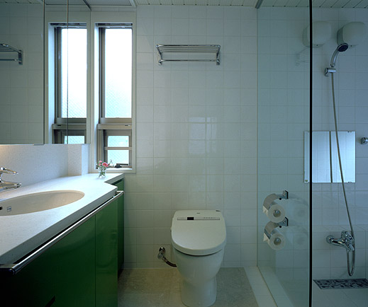 プライベートサニタリーの浴室より、洗面・便所を望む。