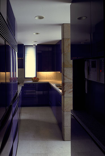 台所はL型プラン。扉は群青色の鏡面塗装。左手は2連の冷蔵庫,右手はこの家のモニター、