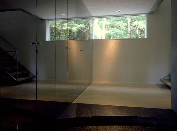 玄関ホール。突き当たりは森に北側眺めを切り取るピクチュアーウィンドー。