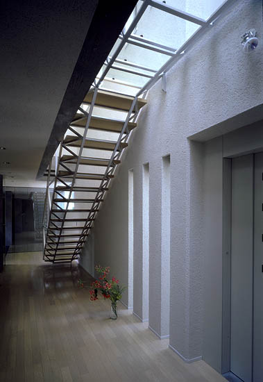 ガラスの踊場からエレベーターホールにトップライトの光が降り注ぐ。