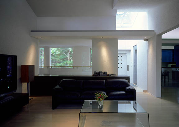 居間から廊下を隔てて、北側の森の緑を望む。