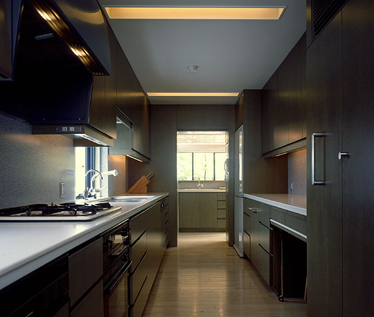 台所、奥のミニキッチン越しに南庭を望む