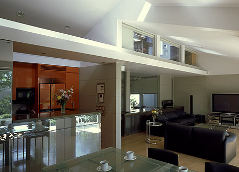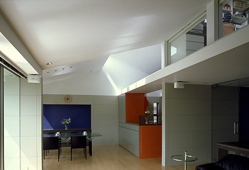 居間より、食堂、台所、右上部に書斎・パソコン室を望む。
