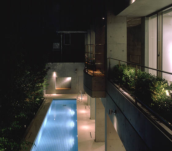 2階アウトドアベンチよりプールを望む。