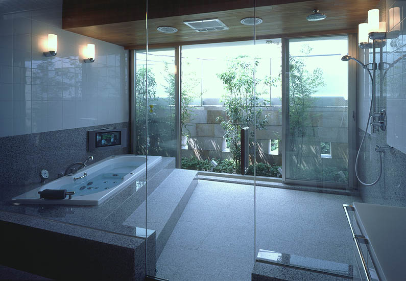 洗い場の御影石の床は、