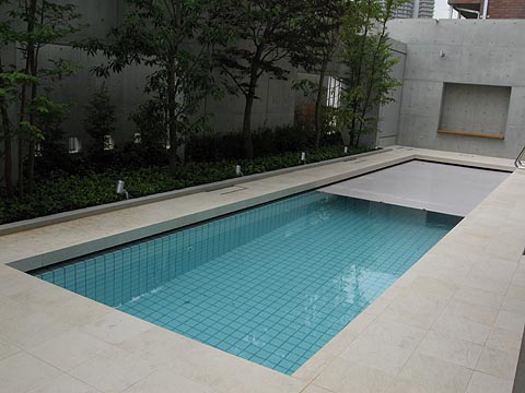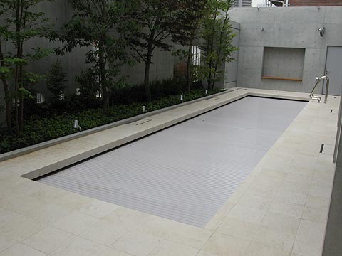 プールカバーはプール水の浮力によって、音もなくスルスルと、ボタン一つで開閉する。