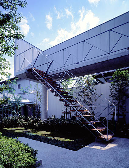 2階ダイニングテラスよりブリッジを渡り階段を降り、1階のプライベートゾーン