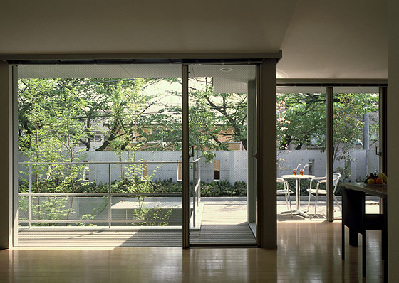 居間よりダイニングテラス、その先に緑道の緑を望む。