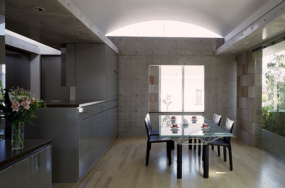 キッチンよりダイニングテラスを望む。