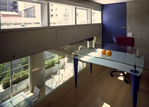 ロフトより下に食堂、庭を見下ろす。上に空を見上げる。