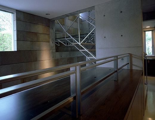 高床1階廊下より玄関ホール、階段を望む。左手の窓は北側風景を望む