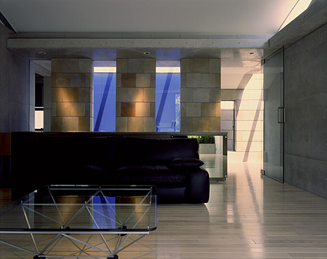 居間より北側廊下を望む。ブルーの扉は廊下に沿った収納。