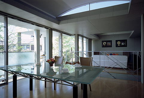 食堂より南庭、居間を望む。